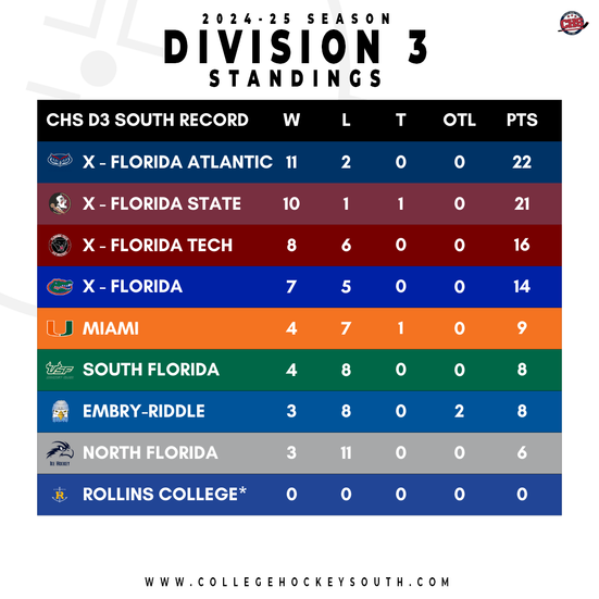 The top five teams from each division will advance to the Division 3 playoffs, taking place February 20-23, 2025, at the Panthers IceDen in Coral Springs, FL. For more information, visit 2025 Division 3 Playoffs.